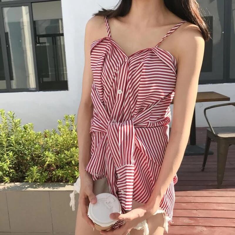 前を留めて普通のブラウスとして、前を開けて羽織りとして、内側にストラップがあるので袖を落として前で結んでキャミソールブラウスとしてと、1着でたくさんの着方を楽しめます。