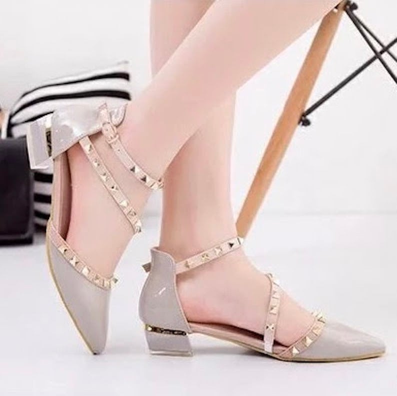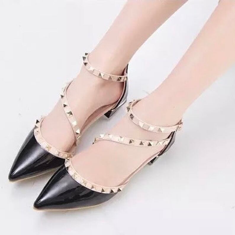 スタッズ付きストラップのエナメルローヒールパンプスです。