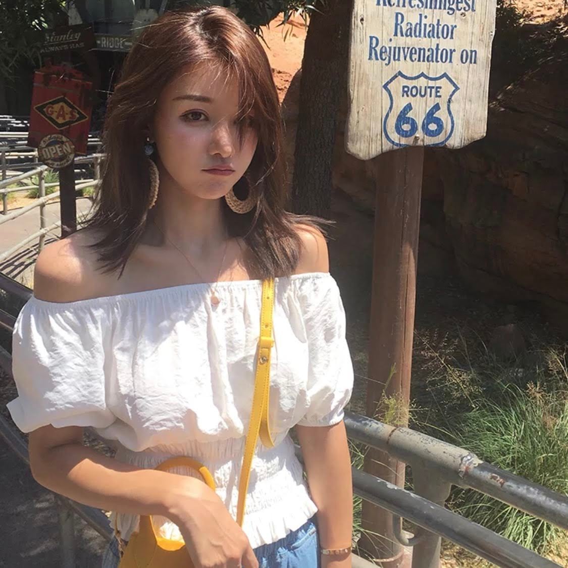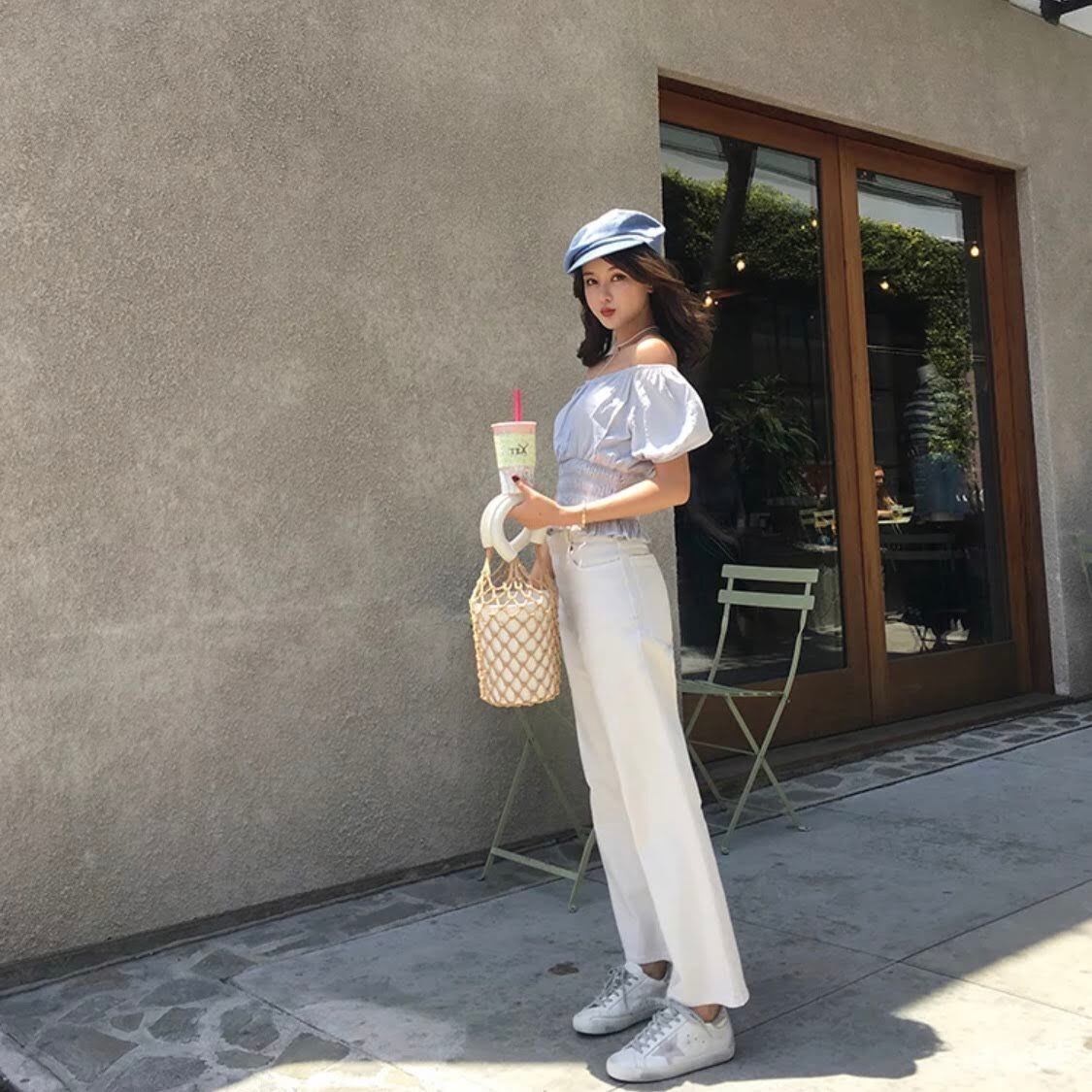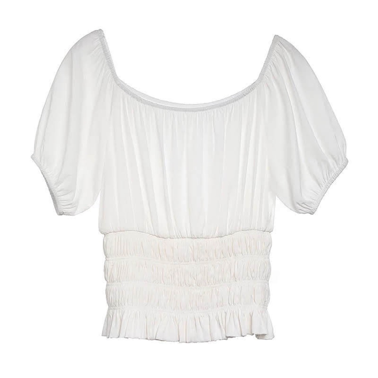 ウエストシャーリングでスッキリしたオフショルダートップスです。