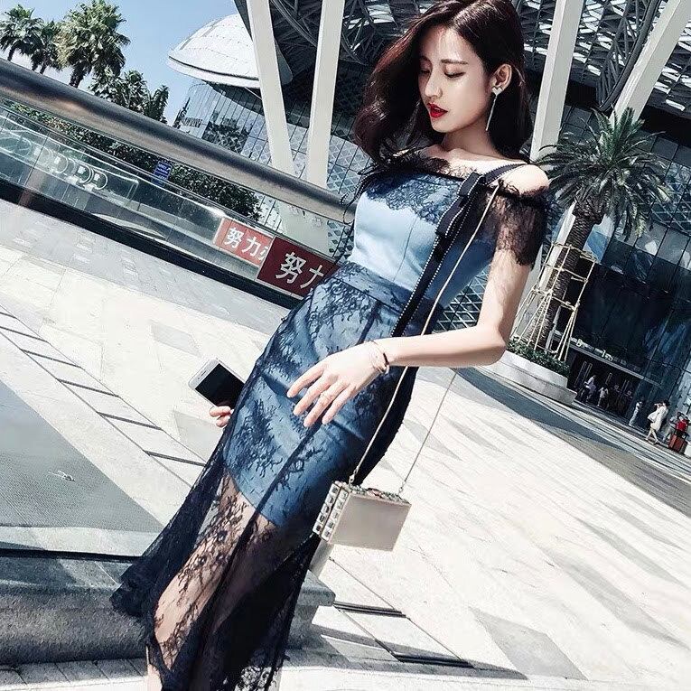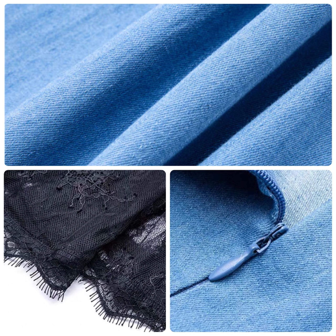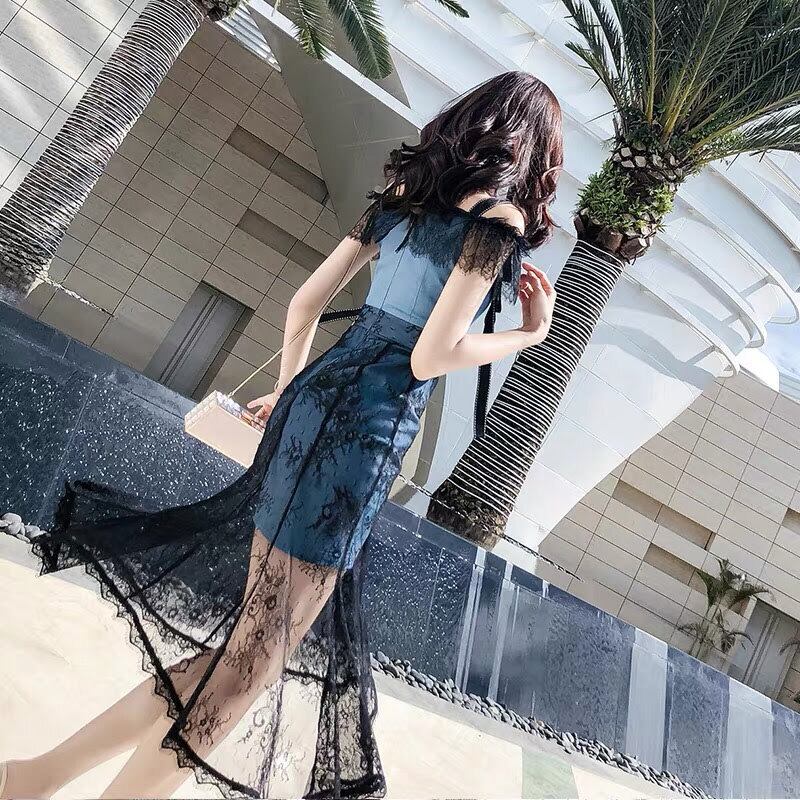 デニムワンピースにブラックレースがドッキングしたワンピースです。