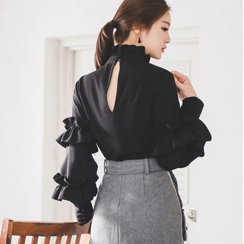 フリルネックの長袖ブラウスです。